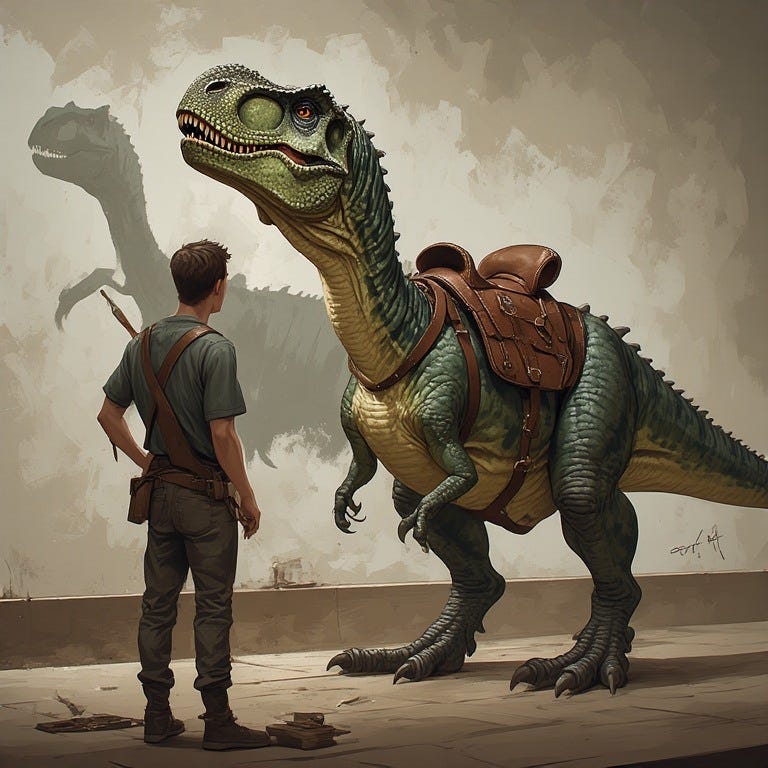 Pulling the ladder closed, he returned it to the shed of the museum, and took several paces back to get a look at the wall he’d just adorned. Rising from the pavement, two enormous clawed-feet rose on tree-trunk like legs, green and scaled and more than five meters tall – small for a Tyrannosaurus Rex, but perfectly sized for the wall of the natural history museum. Michel’s eyes moved back to the saddle he added at the last minute. From where he stood, it wasn’t as obvious as he thought it might be, and perhaps no one would notice – or at least not so much that he wouldn’t get paid.